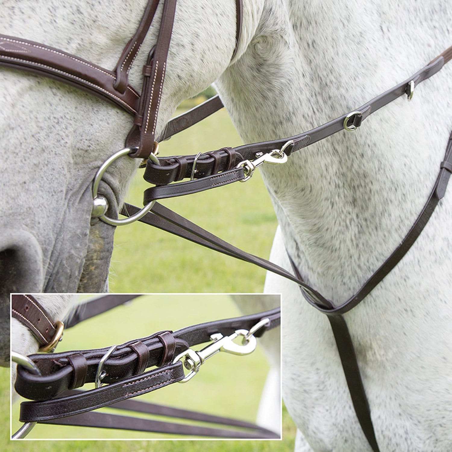 A Running Martingale is considered to be safer than its counterpart the Standing Martingale, as the rider has more control over allowing or restricting the horse's range of head movement. When using a Running Martingale, it’s important to use rein stops. These are placed between the martingale rings and the bit, and they stop the rings from dropping down to the bit and interfering with the lips and mouth of the horse.