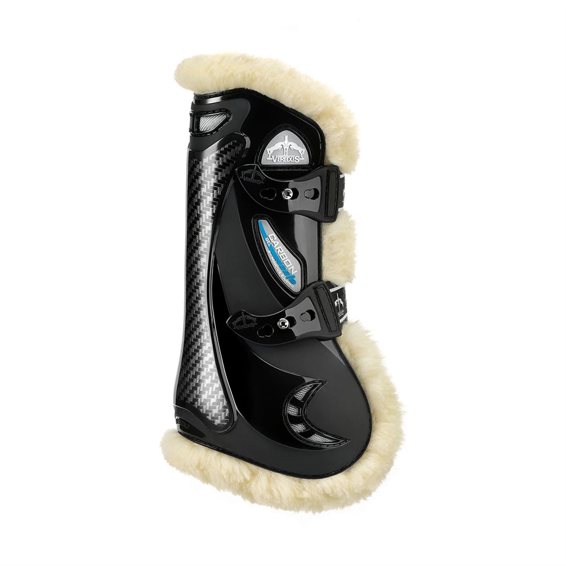 Front tendon boots with double ventilation and Techno Sheepskin liningThe Techno Sheepskin lining- a man-made and totally cruelty-free material- offers great comfort to the horse combined with a unique aesthetic. The techno sheepskin offers numerous advantages:it can be washed easily and dries quickly- while real lambskin requires considerable- lengthy maintenance;trapped sand comes out easily out of the loose- soft wide knit- minimising the risk of abrasions to the leg;it is more comfortable and a cosier fit than natural lambskin;it stays looking good for longer- while real lambskin tends to dry out- become stiff and turn yellow.The Carbon Gel Vento tendon boot is signed by Marcus Ehning and guarantees double ventilation. The heat that is released from the horse's leg passes through the micro-perforated neoprene layer and is distributed in the 3D mesh ducted fabric. Fresh air enters through the air inlets and directs the heat upwards to the outlet grid. The ventilation is therefore both horizontal and vertical. The protection of the front tendons is guaranteed by carbon combined with a Nitrexgel shock absorber film.Double ventilationTendon protection in carbon + NitrexgelTechno Sheepskin liningElastic straps with quick release tipsAnatomic shell