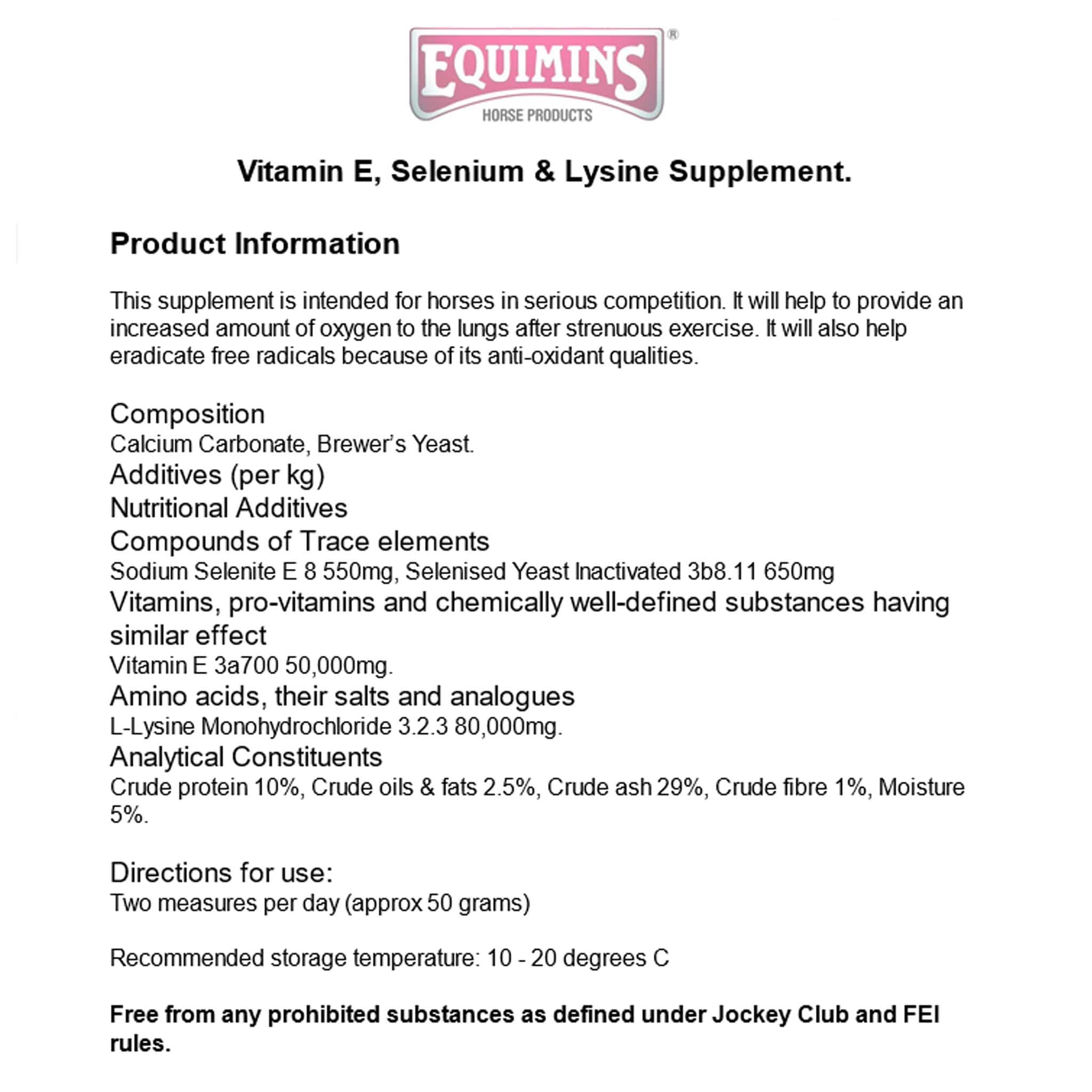 Equimins Vitamin E and Selenium Supplement contains vitamin E at 50,000mg/kg and organic selenium at 25mg/kg for horses in serious training. It will help to provide an increased amount of oxygen to the lungs after strenuous exercise. It will also help eradicate free radicals because of its anti oxidant qualities. A very advanced form of organic selenium is used in this supplement in the form of selenomethionine. It is very much more digestible for a horse than ordinary sodium selenite, and makes a big difference to muscle function. Free from any prohibited substances as defined under Jockey Club and FEI rules.