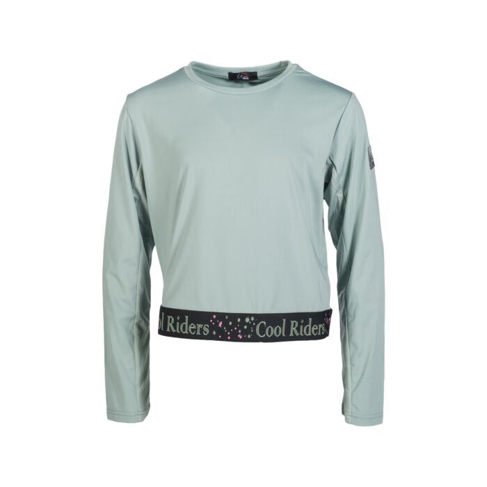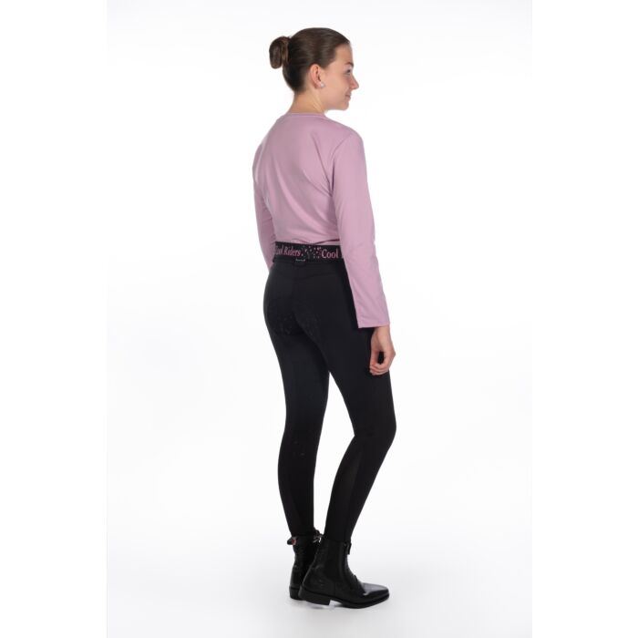 The HKM Functional Shirt � Hailey is a breathable, elastic performance top designed with active young equestrians in mind, featuring strategic mesh inserts under the arms to enhance ventilation and help keep riders cool and dry during training or everyday stable activities; its comfortable, form?fitting fabric provides freedom of movement, while the stylish elastic waistband with fashionable print and shorter, flattering cut make it both practical and chic for riding lessons, lessons or casual wear at the barn.