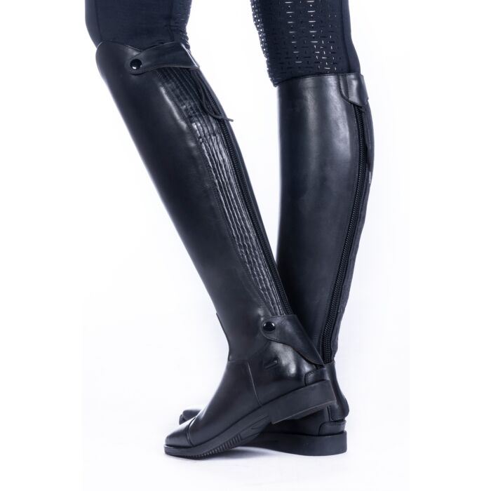The HKM Reitstiefel Oxford combines classic equestrian style with modern comfort. Crafted from high-quality leather, these boots feature a decorative stitch at the toe and a snap button closure for a secure fit. Designed with a rear zipper and an elastic insert, they offer ease of wear and a snug, adjustable fit. The boots also include spur holders, making them suitable for various riding disciplines.