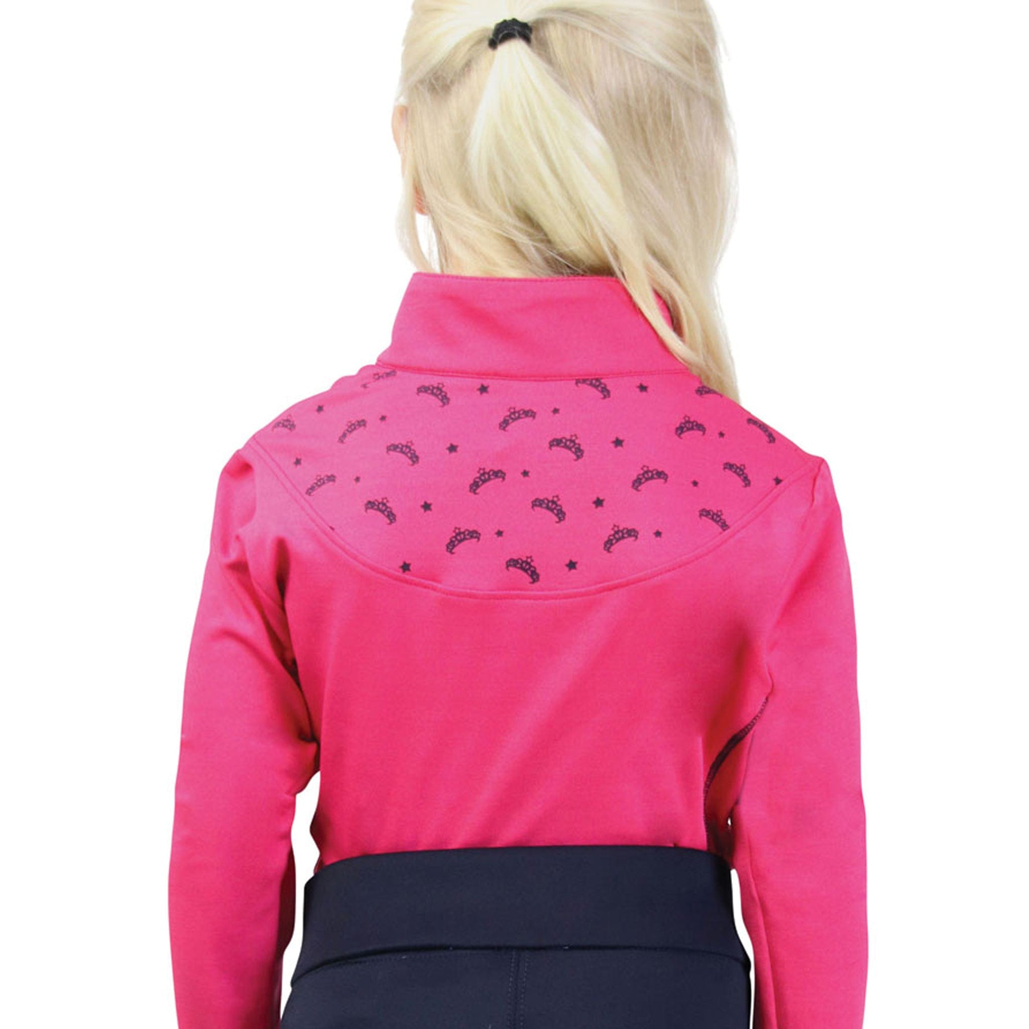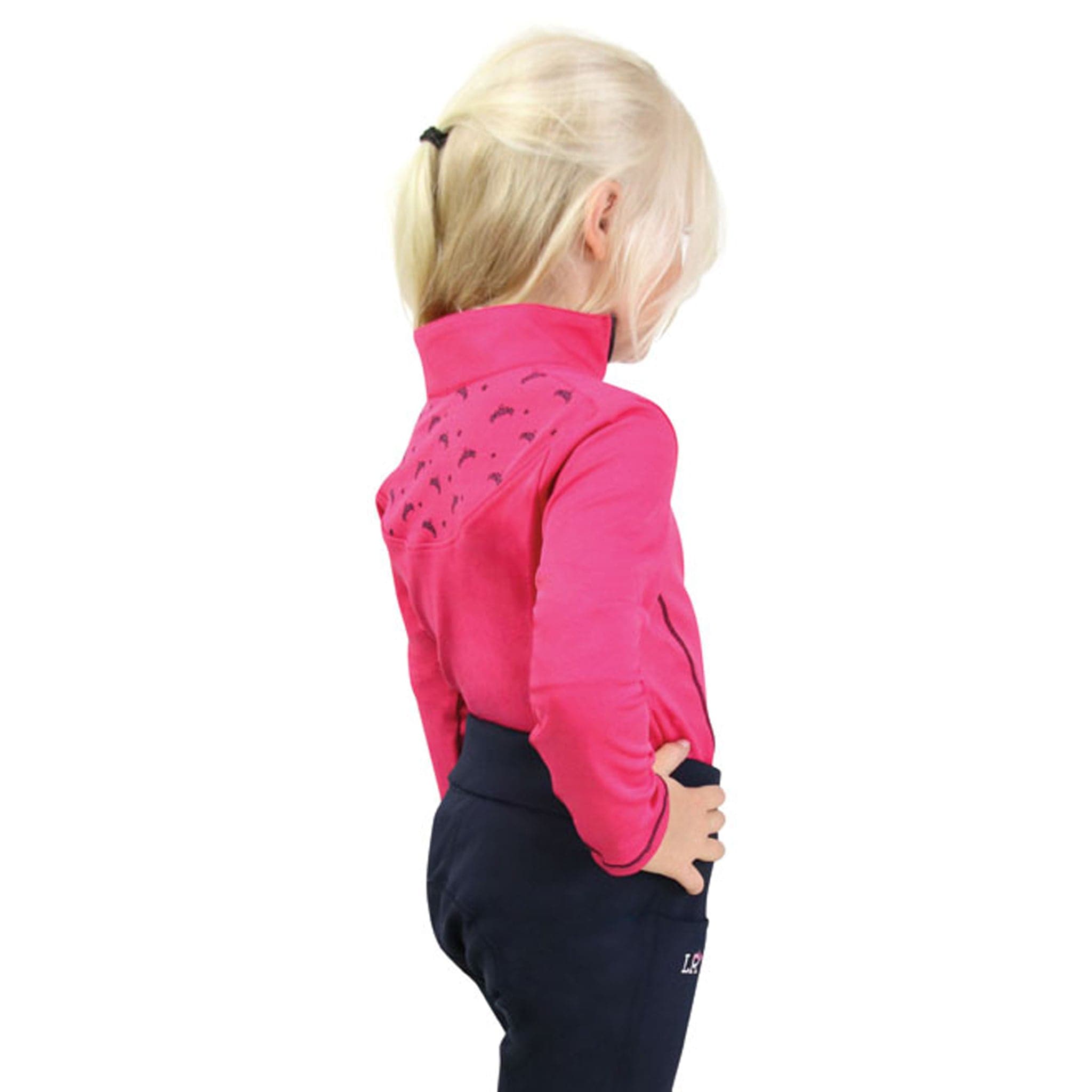 The Hy Little Rider Sara Base Layer is perfect for those who loves being outdoors. Made from a breathable four-way stretch fabric, this practical yet pretty base layer is designed for comfort and warmth. It features a fashionable crown print to the back of the neck alongside with contrasting stitching and the classic Little Rider emblem on the chest. Designed with a quarter zip on the front, making dressing quick and simple for those eager riders! Ideal to wear alone or as a layer with a gilet for those colder days down the stables. Available in Pink and Navy or Navy and Pink. Complete your child's riding outfit with the matching riding tights.