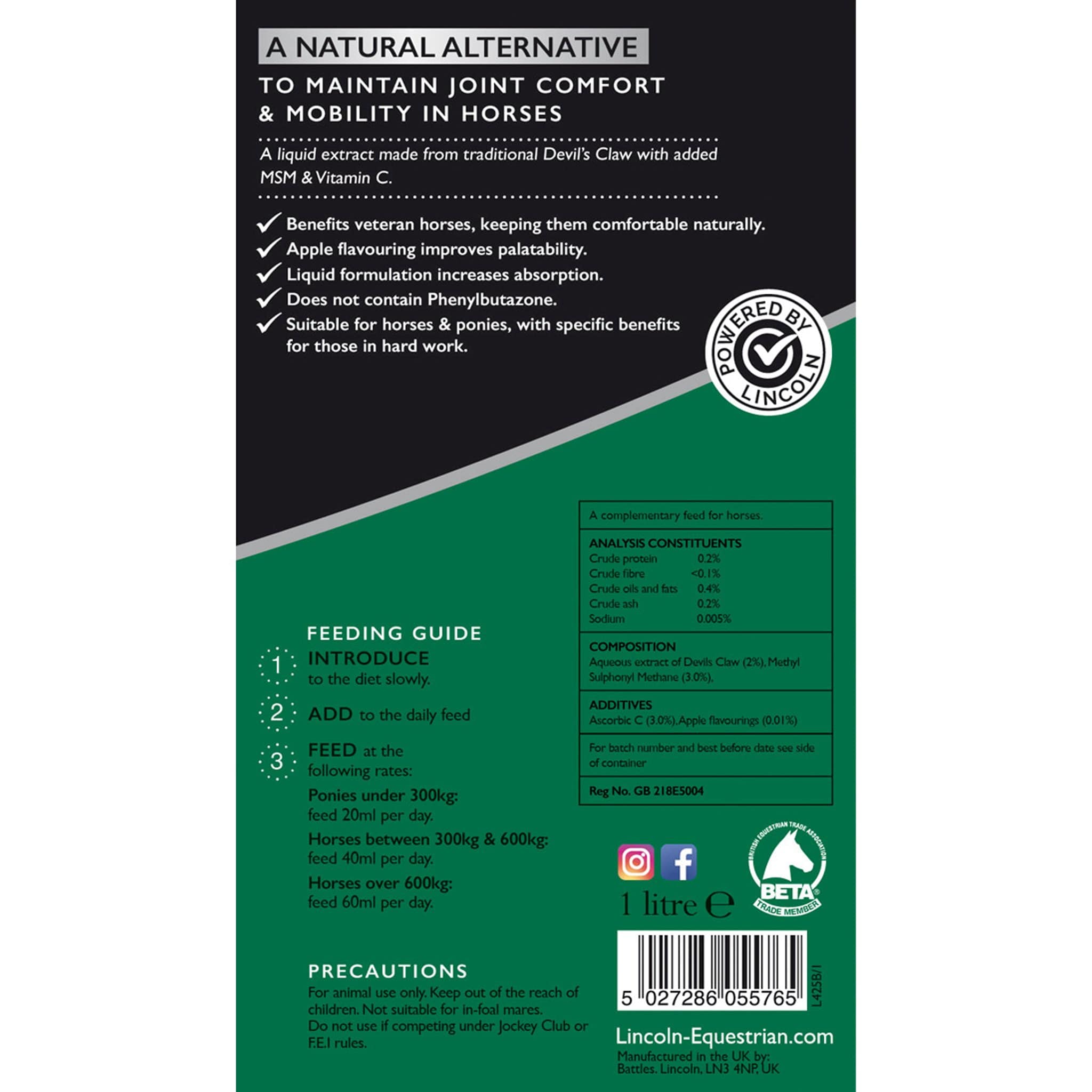 Lincoln Devil's Claw+ is a liquid supplement containing three natural ingredients; superior grade Devil's Claw, reputed for its natural effect on joint discomfort, MSM (Methylsulfonylmethane) and Vitamin C (Ascorbic acid). This combination optimises the combined benefits to provide natural relief from discomfort in hard working joints and tissues, promoting ease of movement and flexibility. Devil's Claw is considered an effective, natural, drug-free, herbal alternative in the management of horses requiring additional support for joints and mobility.