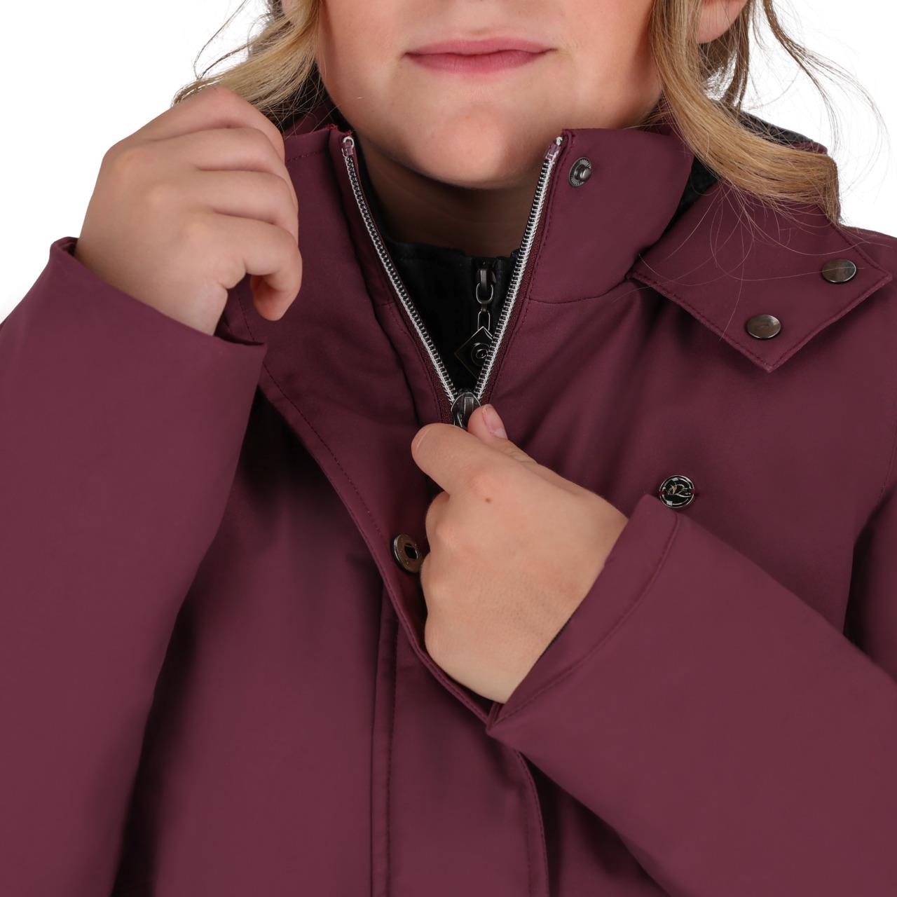 The Maelynn winter jacket from the winter collection features a hood that can be secured to prevent it from blowing up while riding. The jacket has a warm lining on the inside and elastic cuff closures for extra comfort, making it perfect for cold days. Additionally, the jacket is equipped with a practical two-way zipper and handy side pockets.