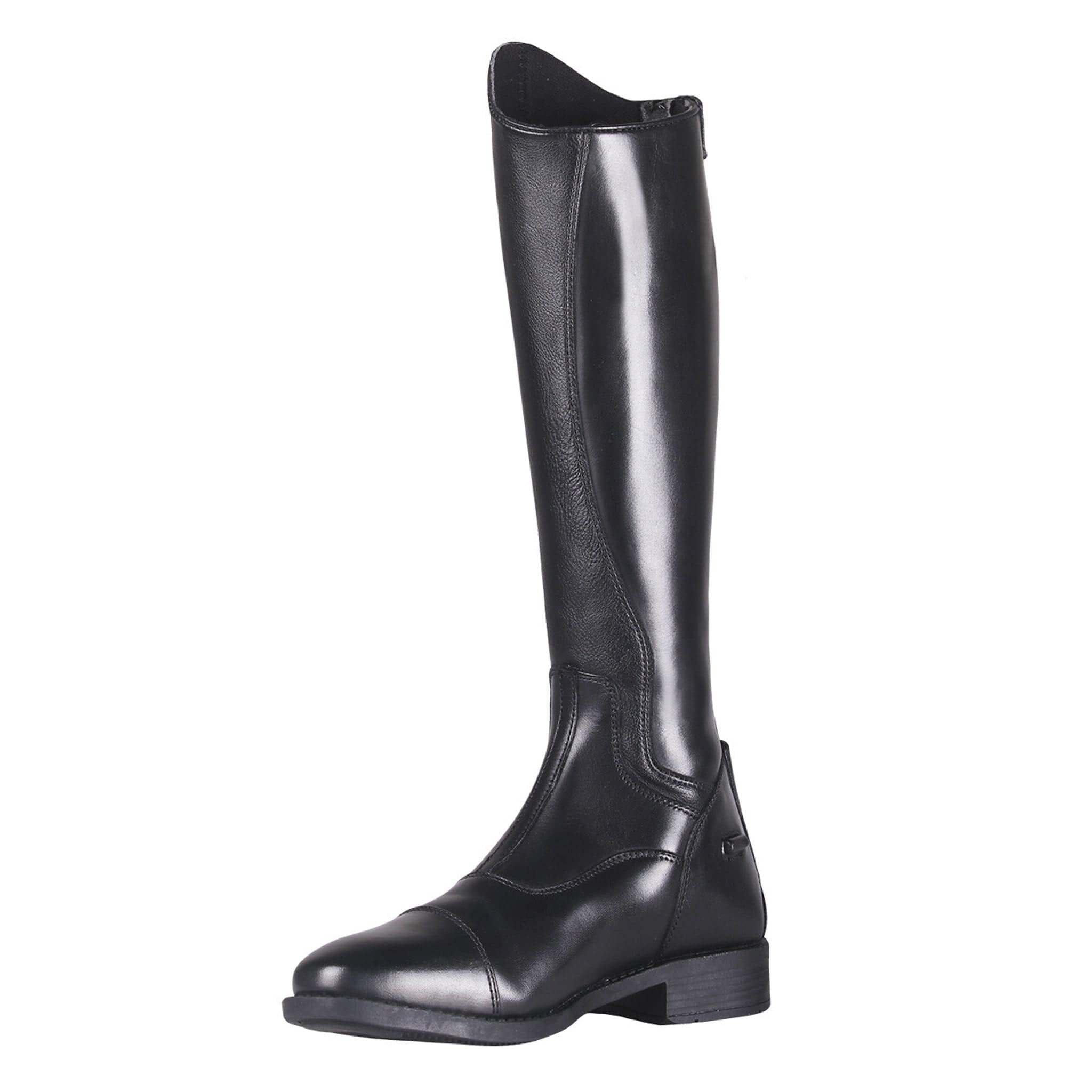 The QHP Children's Birgit Riding Boots are made from textured leather for a modern, cool look. Featuring a smart dressage bow at the top of the calf, these tall kids riding boots have a natural stretch in the calf material for a snug yet comfortable fit. The rear zip makes them easy to put on, with an elasticated snap closure at the top for extra security, and a zip protector at the back of the heel. Perfect for competitions and everyday riding.