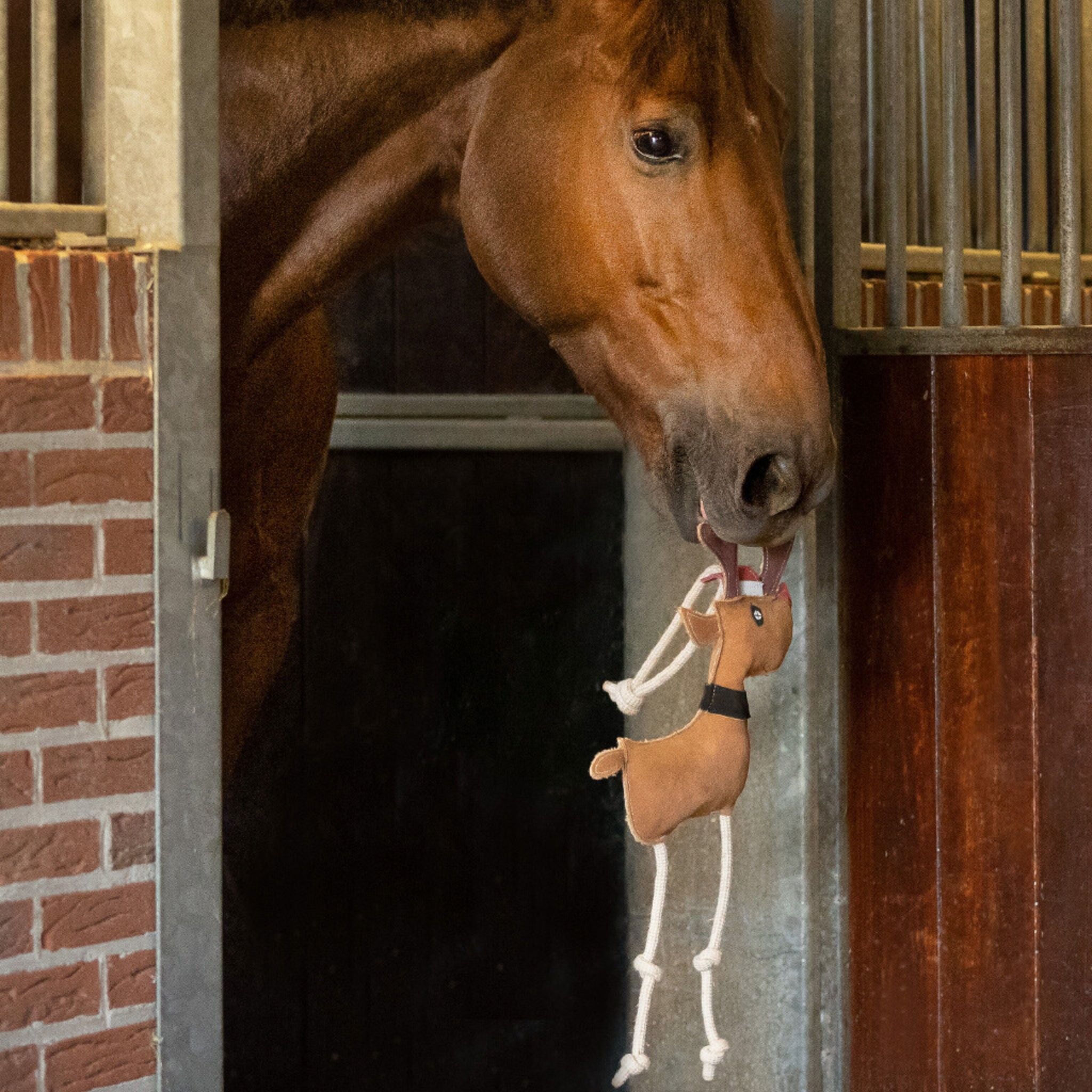 The QHP Horse Toy is perfect for keeping your equine entertained. Designed to reduce boredom, this cuddly toy is ideal for stabled horses to keep them distracted. It's easy to hang up and is made from safe materials so your horse can enjoy it for hours. Available in Pink Unicorn, Grey Horse Head, Rudolph, Apple or Orange Carrot.