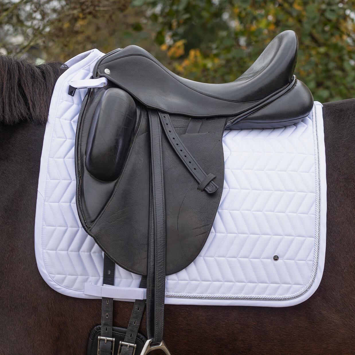The luxurious Sennah saddle pad from the winter collection features decorative stitching and a two-colored decorative cord at the back. The saddle pad features a Q-pin on the left side and is lined with absorbent mesh to absorb sweat. The girth loops and short D-ring loops with hook-and-loop fasteners ensure that the saddle pad stays in place while riding.