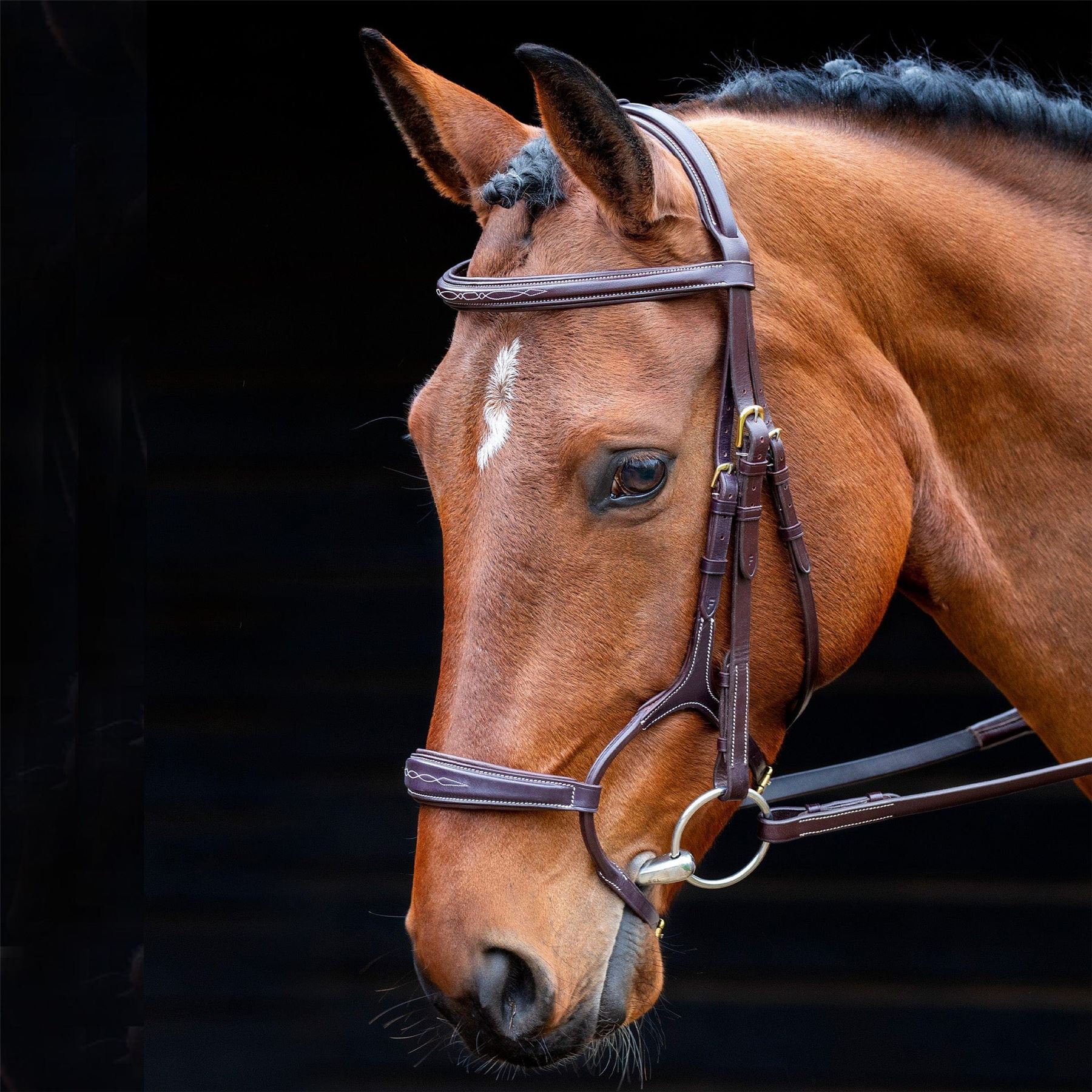 Contemporary and beautifully designed, the Salisbury Brampton bridle benefits from anatomical features that grant the horse enhanced comfort. The padded, curved noseband avoids the facial bones and sensitive nerves of the jaw and cheekbones for a comfortable fit and encourages a relaxed and enhanced performance. The unique design of the cavesson noseband allows full adjustability in its positioning for a custom fit. The overlay headpiece reduces pressure, increasing comfort over the poll. Hook stud billets, quality fittings and rubber grip reins. SALISBURY LEATHERWORK: Elegant. Detailed. Smart. Graceful designs in a high shine finish, characterised by feature stitching detail. Durable and beautifully finished Salisbury leatherwork is synonymous with quality. Vegetable tanned leather for a more sustainable finish. Smart for both competition and everyday use. Australian Nut Extra Full.